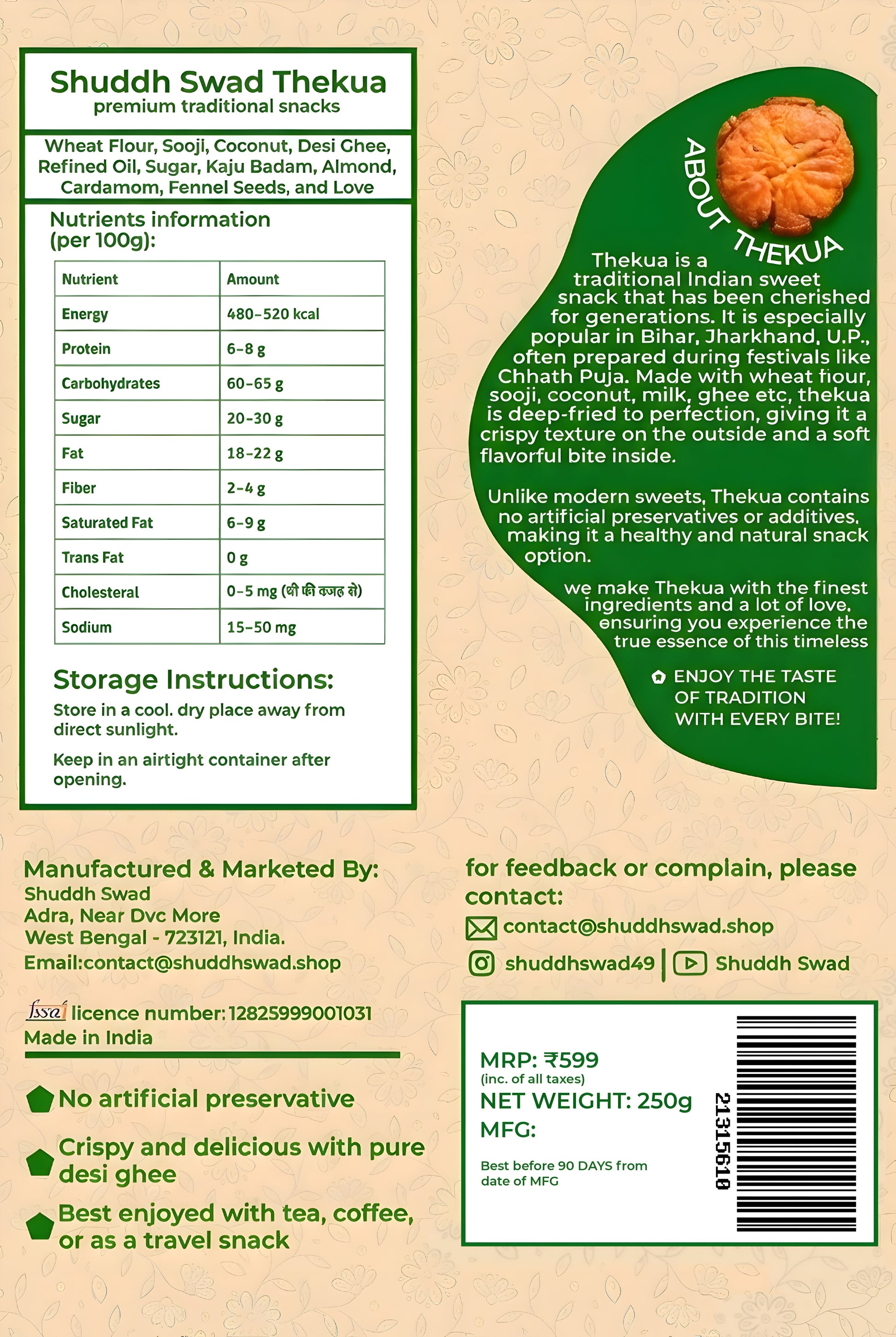 Traditional Thekua is a cherished traditional snack, steeped in the cultural heritage of Bihar and Jharkhand. Known as the “prasad of Chhath Puja,” it carries the essence of togetherness and devotion. Each bite of our jaggery Thekua brings you closer to the authentic flavors of India, crafted with love and care to preserve its age-old charm.